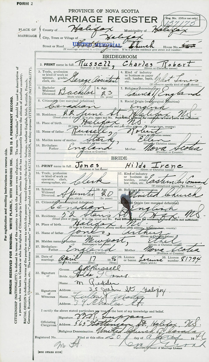 28. Date of marriage April 17 1946 29. By license or banns License 30. License number 81794
