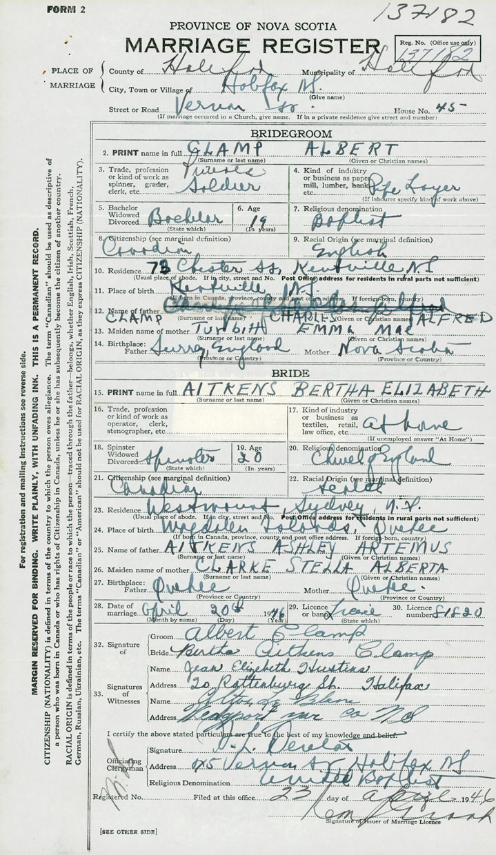 28. Date of marriage April 20 1946 29. By license or banns License 30. License number 81820
