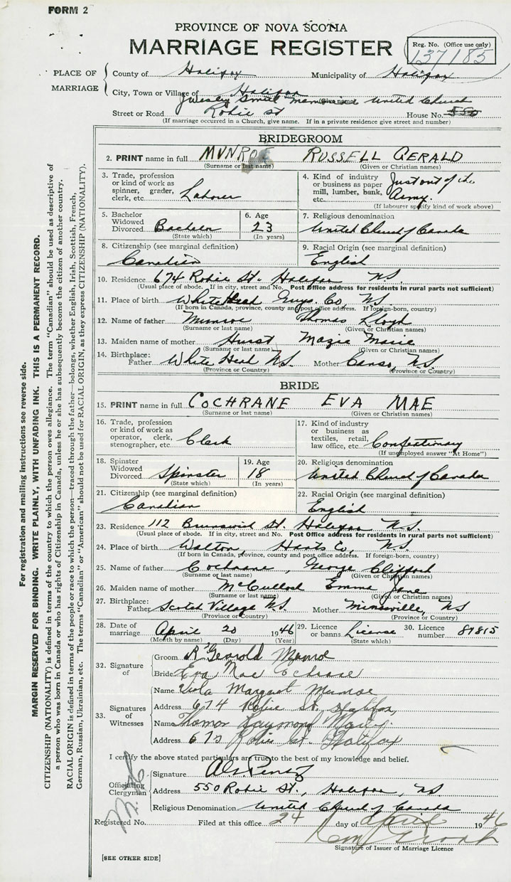 28. Date of marriage April 20 1946 29. By license or banns License 30. License number 81815