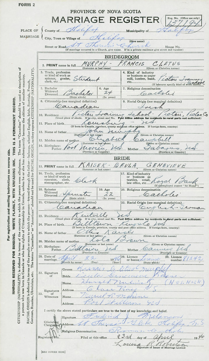 28. Date of marriage April 22 1946 29. By license or banns License 30. License number 81242