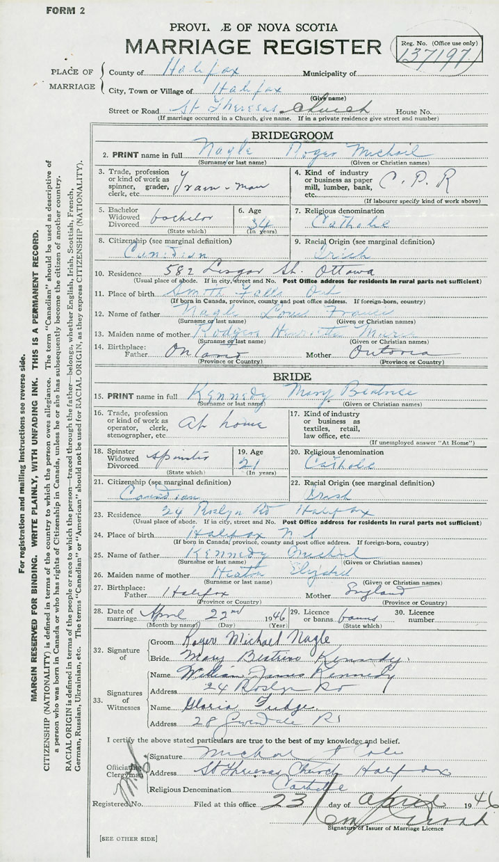 28. Date of marriage April 22 1946 29. By license or banns License 30. License number