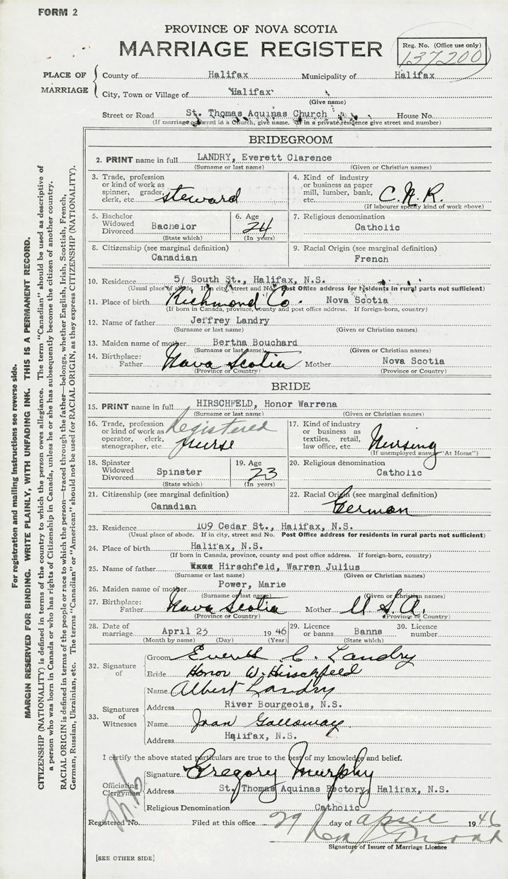 28. Date of marriage April 23 1946 29. By license or banns License 30. License number