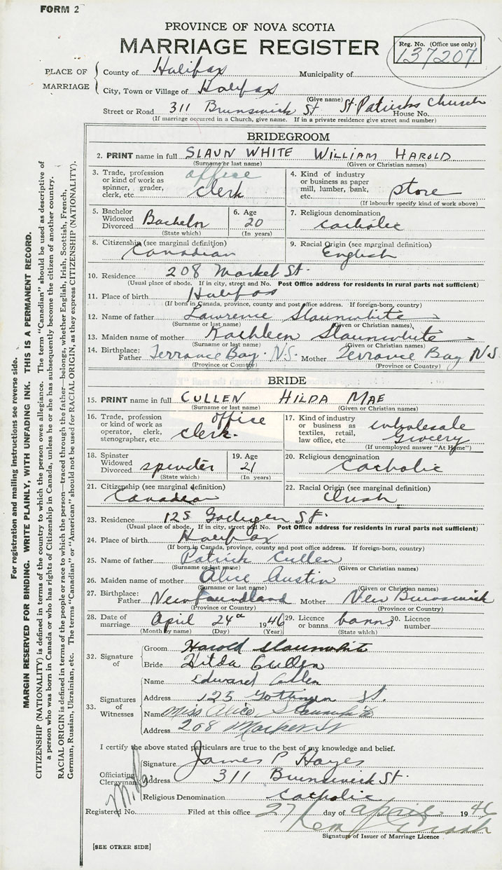 28. Date of marriage April 24 1946 29. By license or banns Banns 30. License number Banns