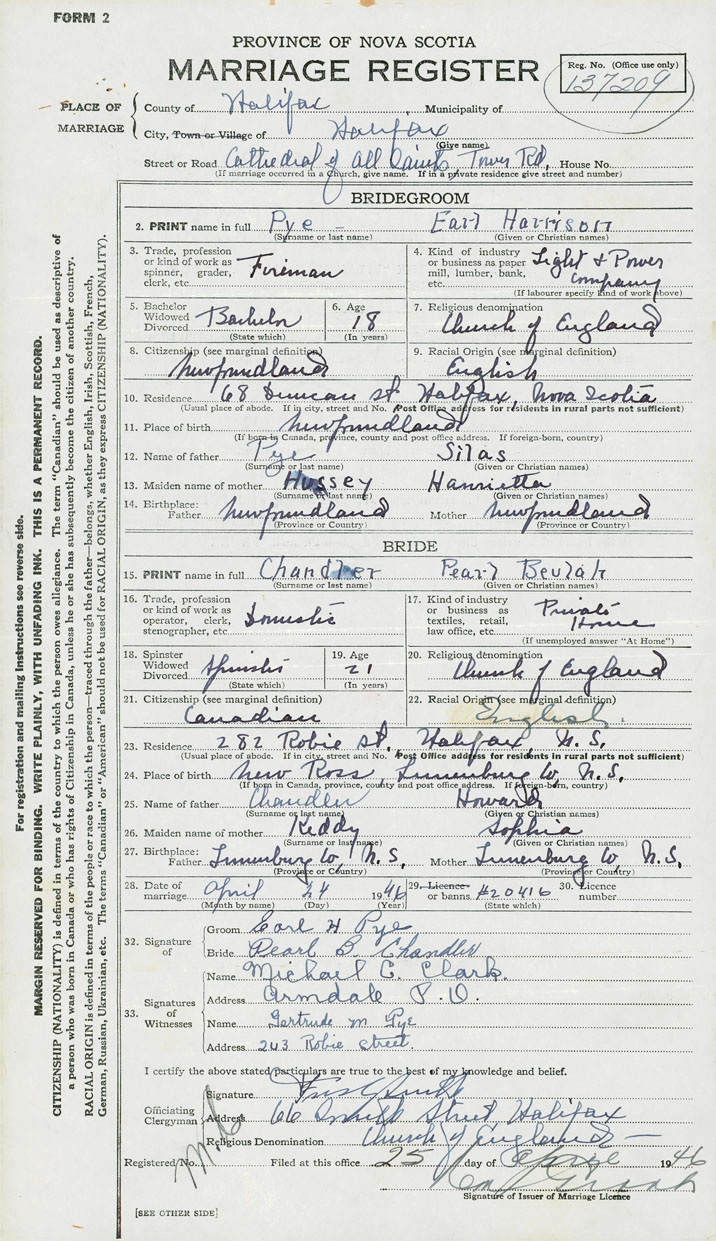 Groom Earl Harrison Pye