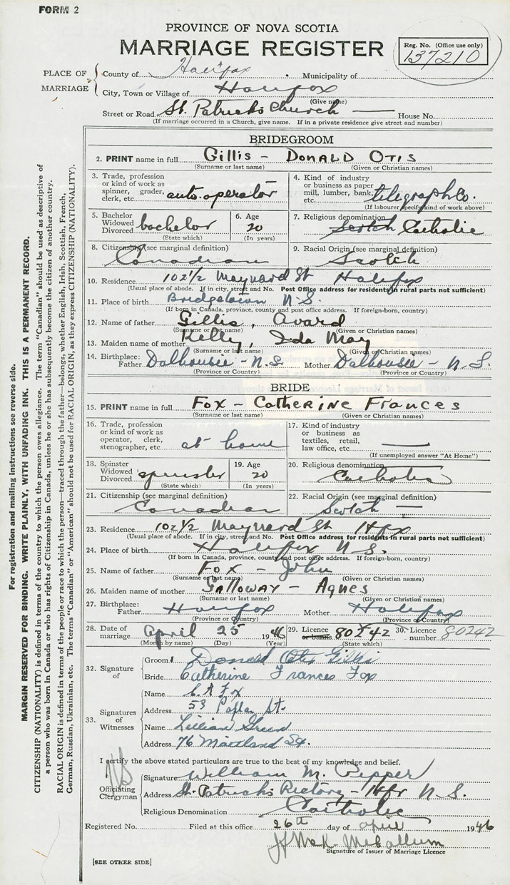 28. Date of marriage April 25 1946 29. By license or banns License 30. License number 80242