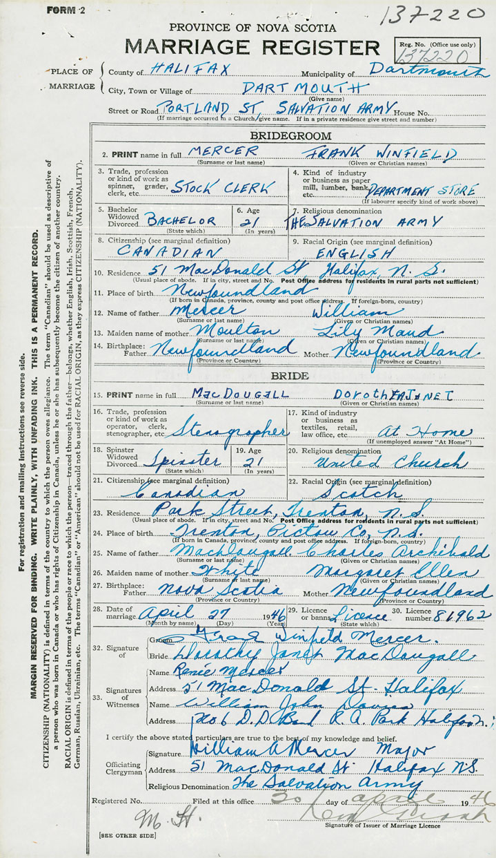 28. Date of marriage April 27 1946 29. By license or banns License 30. License number 81962
