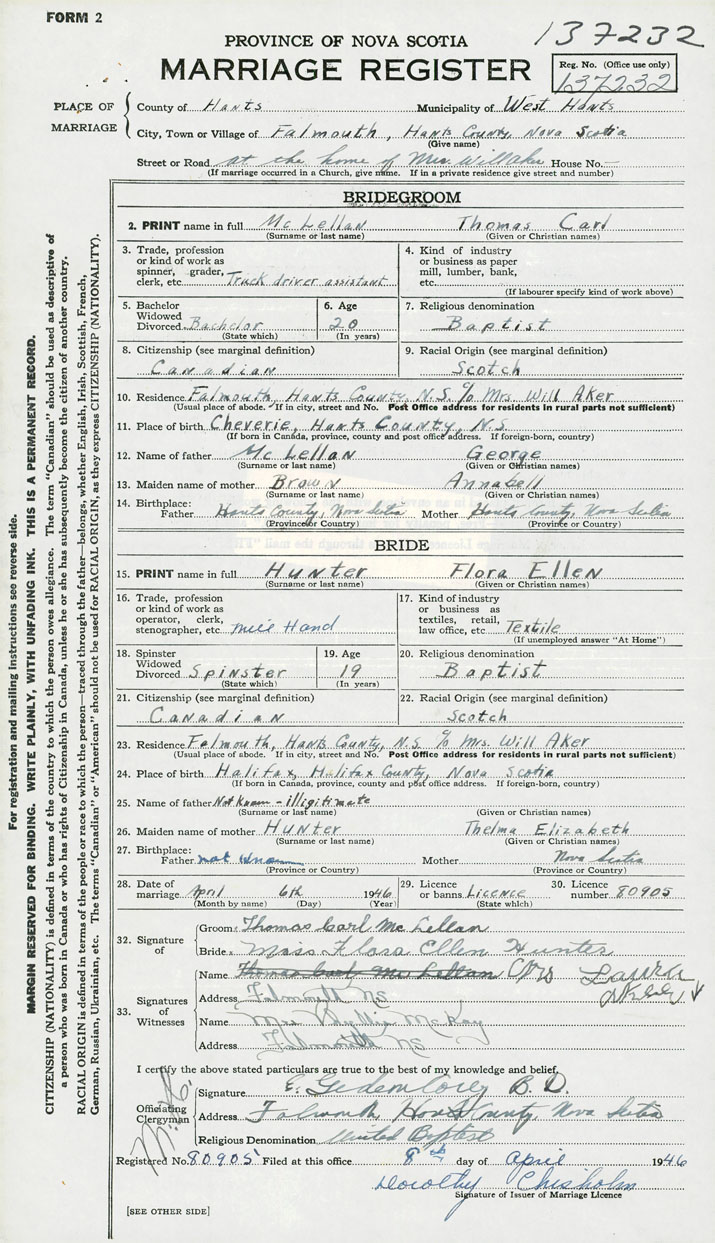 28. Date of marriage April 6 1946 29. By license or banns License 30. License number 80905