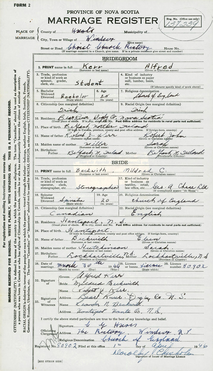 28. Date of marriage March 30 1946 29. By license or banns License 30. License number 80902