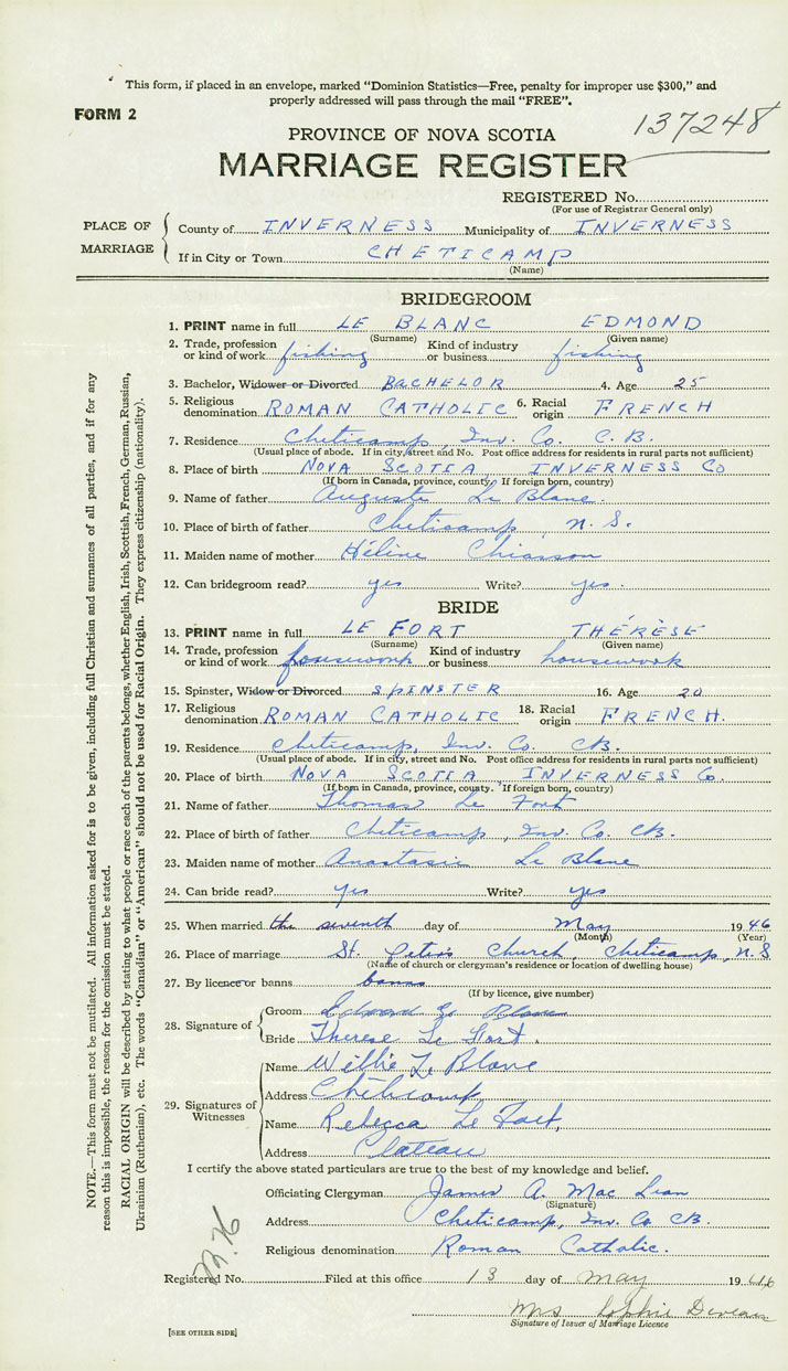 PLACE OF MARRIAGE County of Inverness in City or Town Cheticamp