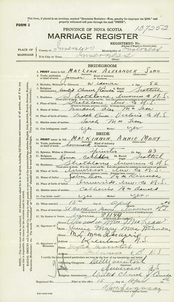 PLACE OF MARRIAGE County of Inverness in City or Town Inverness