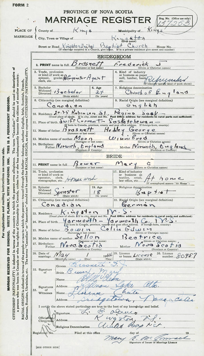 28. Date of marriage May 1 1946 29. By license or banns License 30. License number 80957