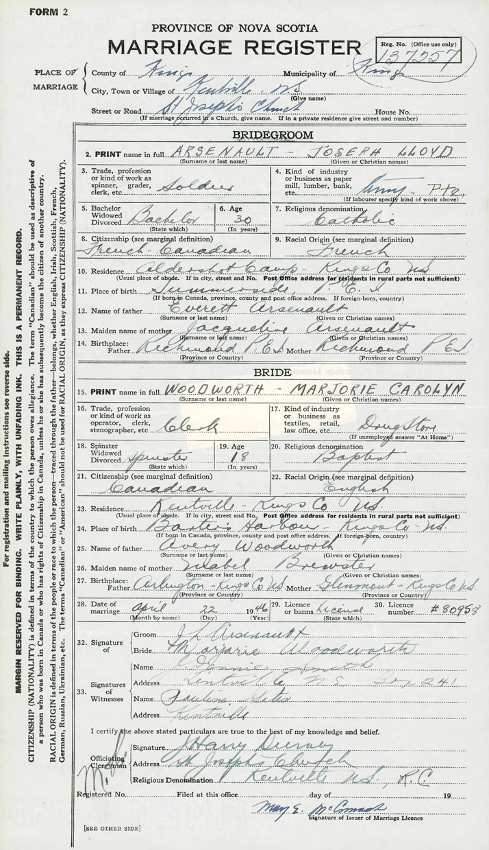 28. Date of marriage April 22 1946 29. By license or banns License 30. License number 80958