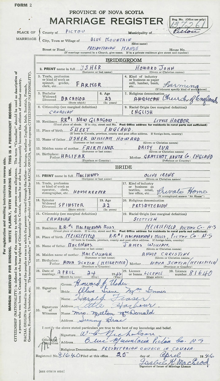 28. Date of marriage April 24 1946 29. By license or banns License 30. License number 81640