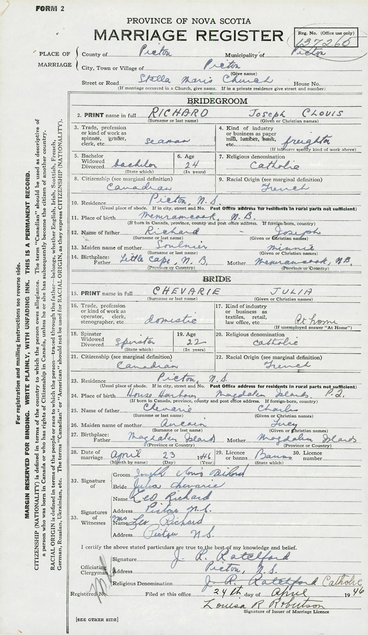 28. Date of marriage April 23 1946 29. By license or banns License 30. License number