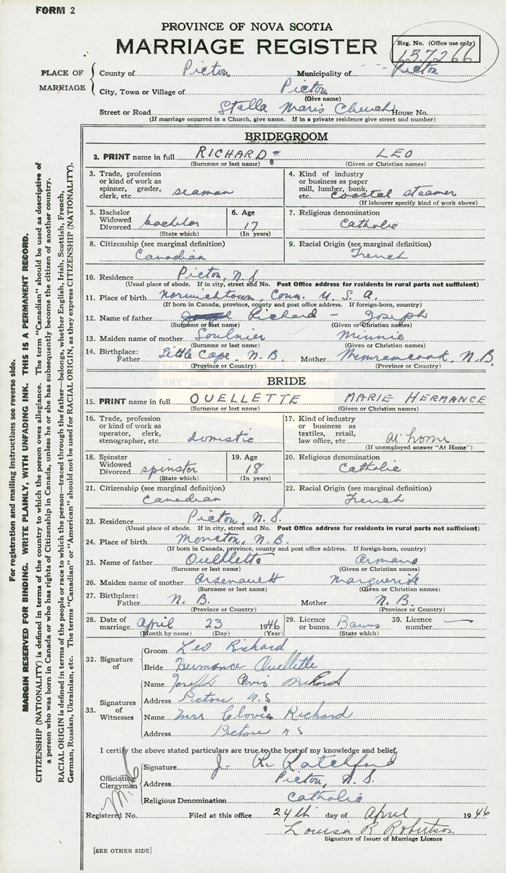 14. Birthplace Father Little Cape, New Brunswick Mother Memramcook, New Brunswick