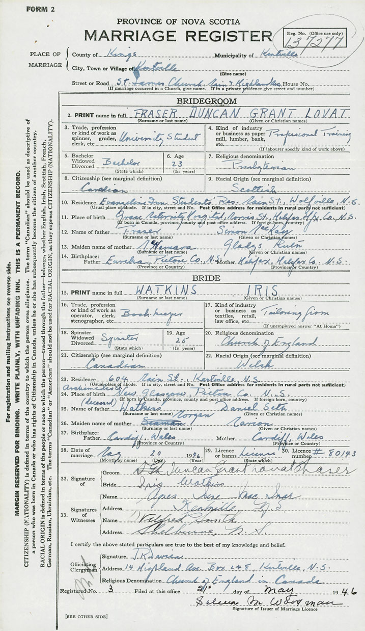 28. Date of marriage May 20 1946 29. By license or banns License 30. License number 80143