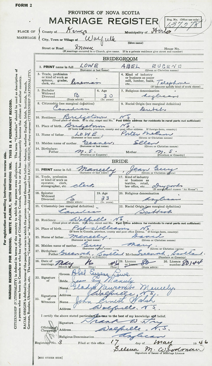 28. Date of marriage May 16 1946 29. By license or banns License 30. License number 80144