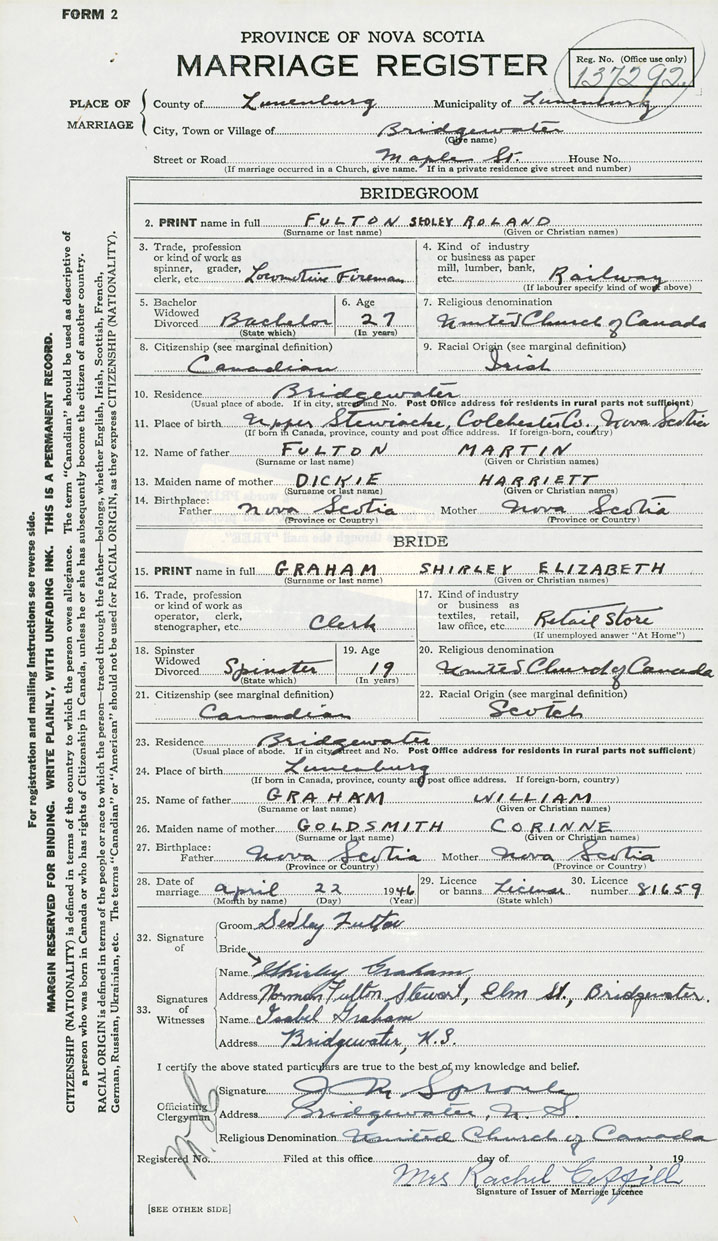 28. Date of marriage April 22 1946 29. By license or banns License 30. License number 81659
