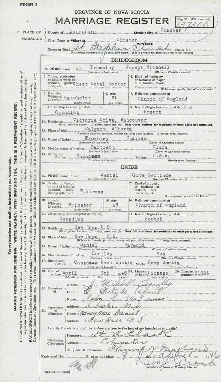 28. Date of marriage April 6 1946 29. By license or banns License 30. License number 81684