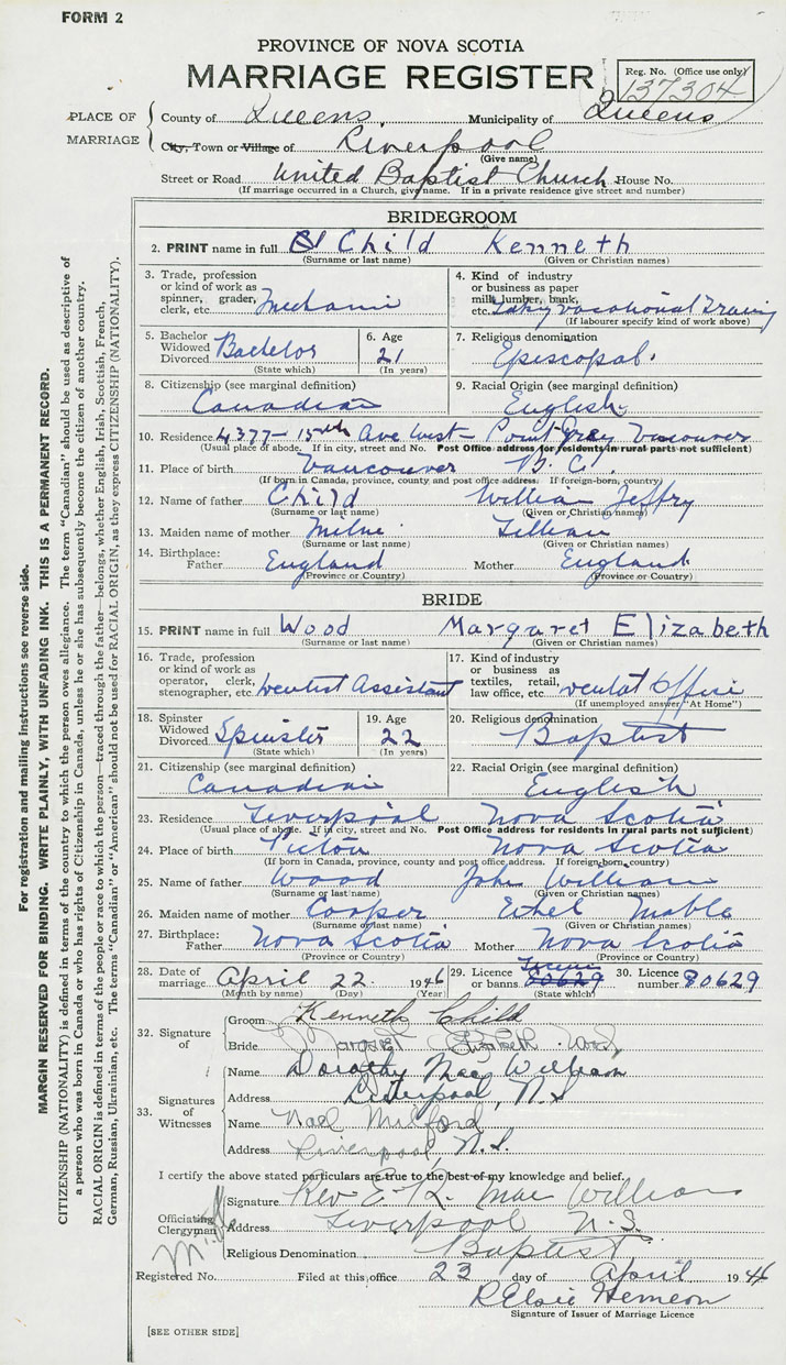 28. Date of marriage April 22 1946 29. By license or banns License 30. License number 80629