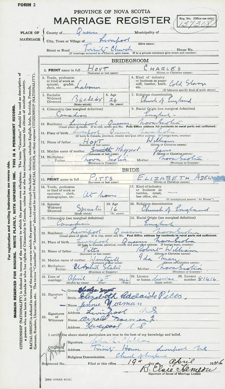 28. Date of marriage April 16 1946 29. By license or banns License 30. License number 81416