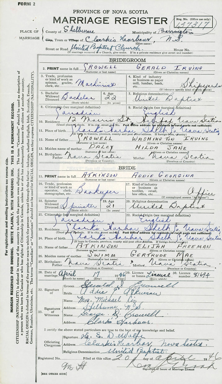 28. Date of marriage April 17 1946 29. By license or banns License 30. License number 81694