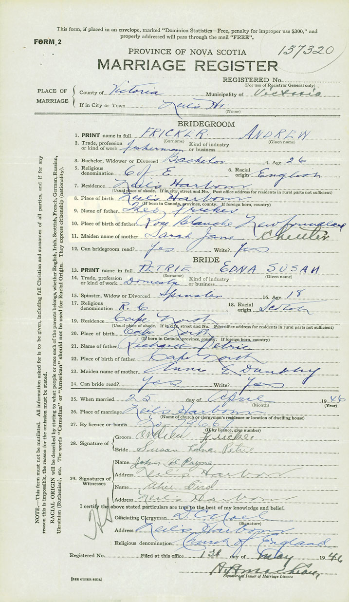 PLACE OF MARRIAGE County of Victoria in City or Town Neils Harbour