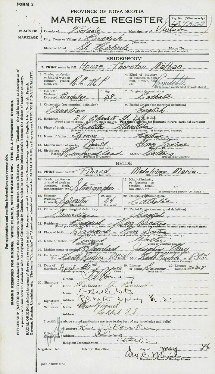 28. Date of marriage April 30 1946 29. By license or banns License 30. License number 20208