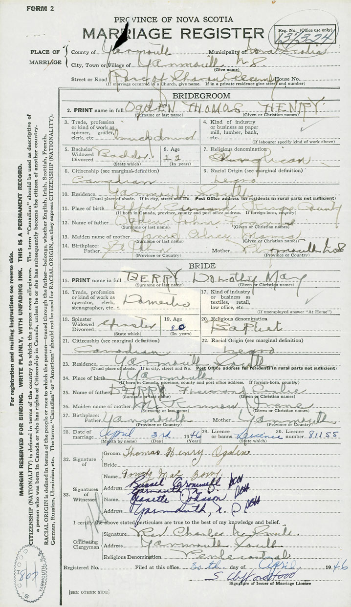 28. Date of marriage April 3 1946 29. By license or banns License 30. License number 81155