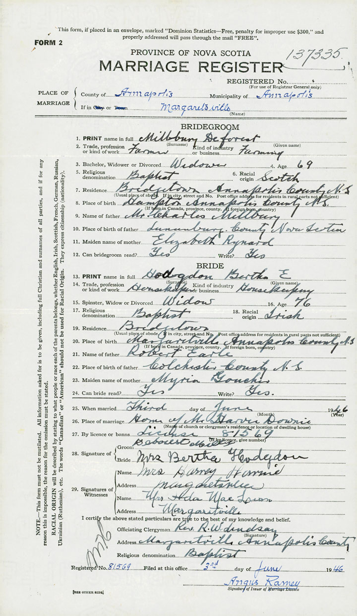 PLACE OF MARRIAGE County of Annapolis in City or Town Margaretsville