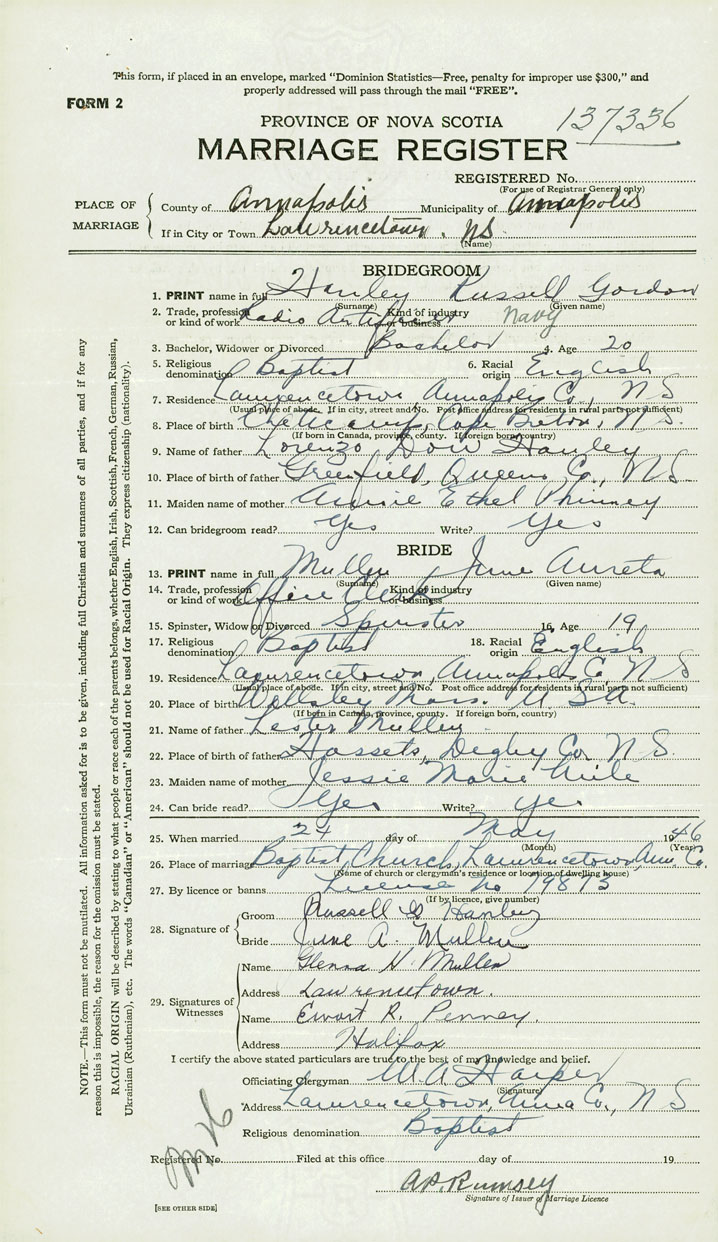 PLACE OF MARRIAGE County of Annapolis in City or Town Lawrencetown