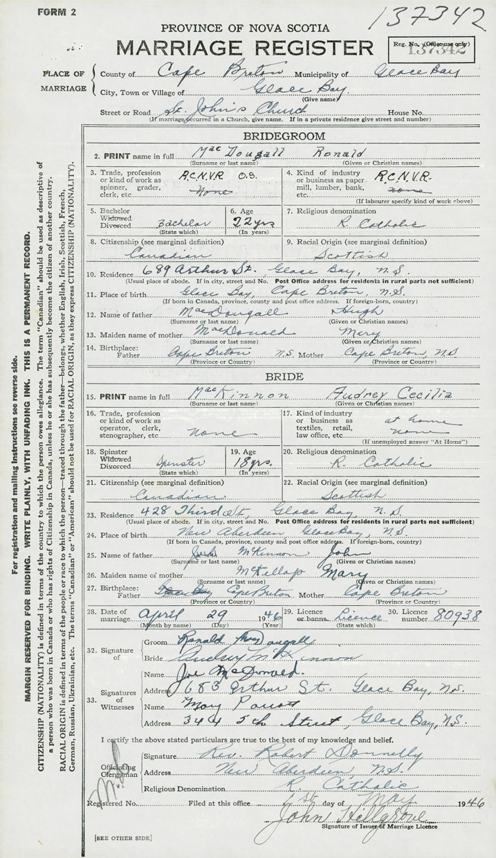 28. Date of marriage April 29 1946 29. By license or banns License 30. License number 80938