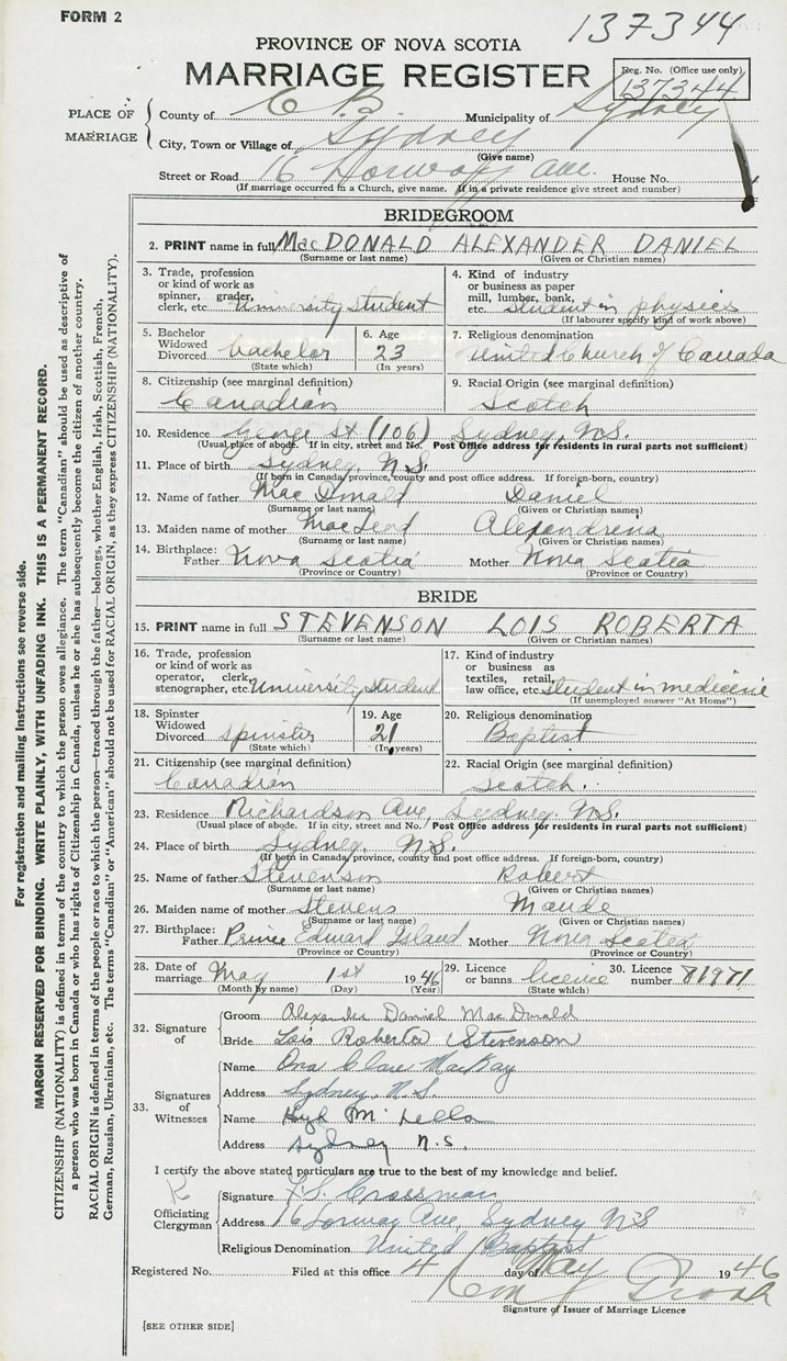 28. Date of marriage May 1 1946 29. By license or banns License 30. License number 81971