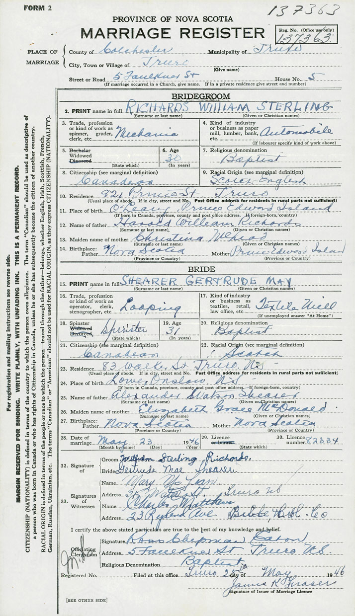 28. Date of marriage May 23 1946 29. By license or banns License 30. License number 82334