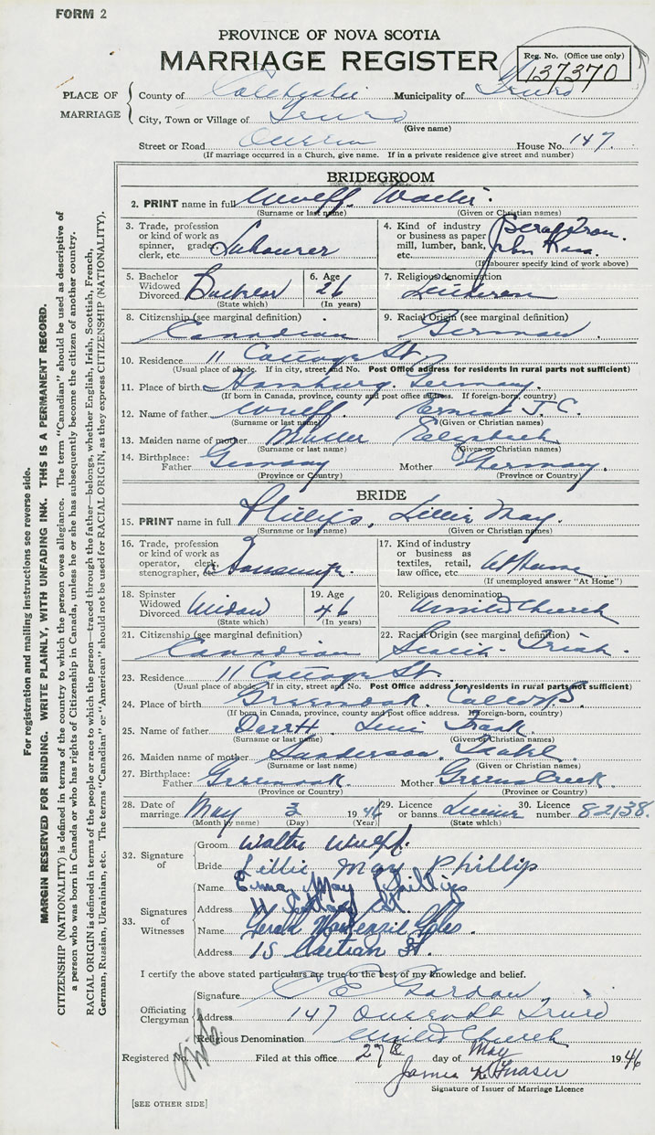 28. Date of marriage May 3 1946 29. By license or banns License 30. License number 82138