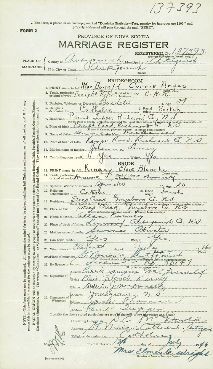 PLACE OF MARRIAGE County of Antigonish in City or Town Antigonish