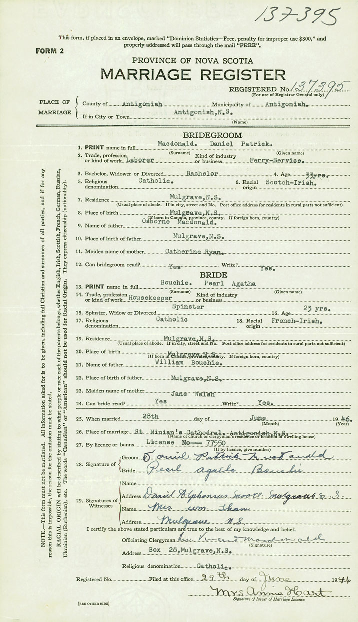 PLACE OF MARRIAGE County of Antigonish in City or Town Antigonish