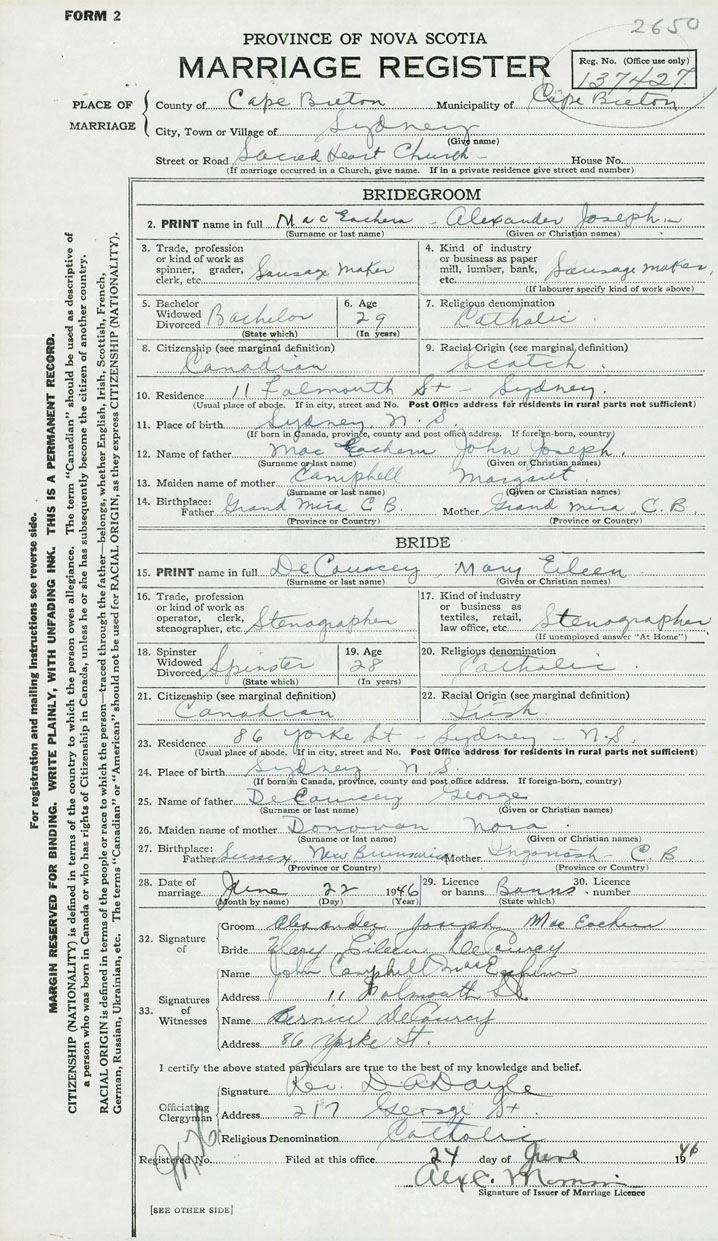 27. Birthplace Father Sussex, New Brunswick Mother Ingonish, Cape Breton County