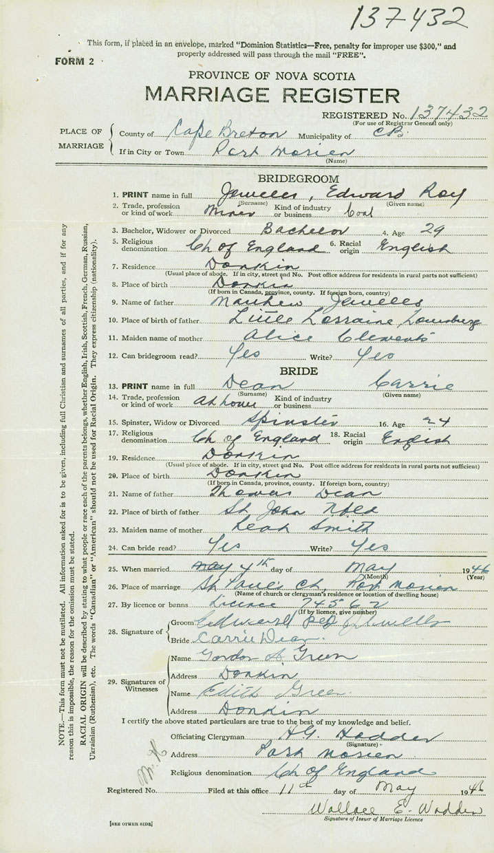 PLACE OF MARRIAGE County of Cape Breton in City or Town Port Morien