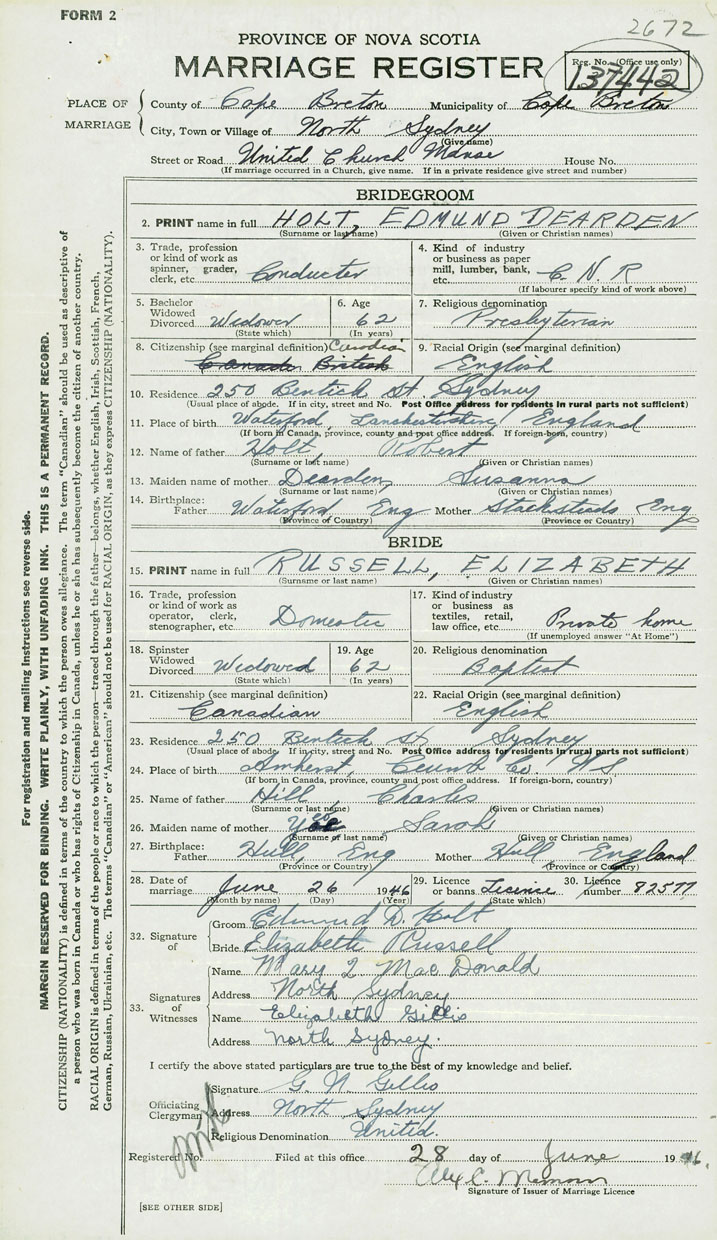 28. Date of marriage June 26 1946 29. By license or banns License 30. License number 82577