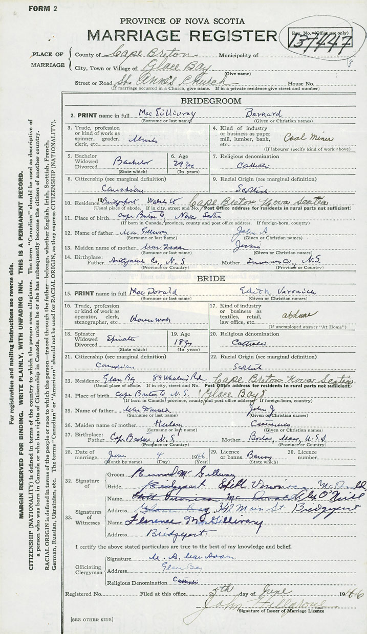 28. Date of marriage June 4 1946 29. By license or banns License 30. License number