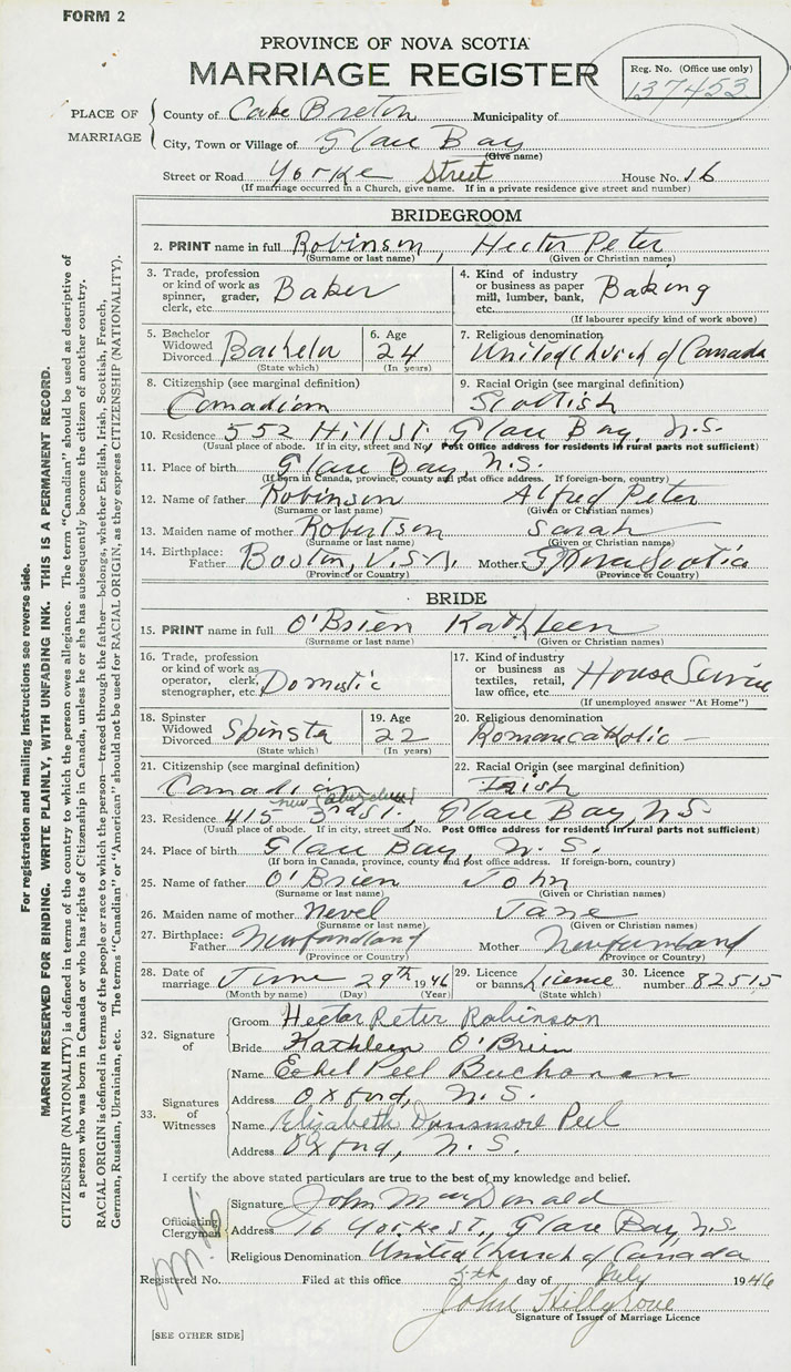 28. Date of marriage June 29 1946 29. By license or banns License 30. License number 82515