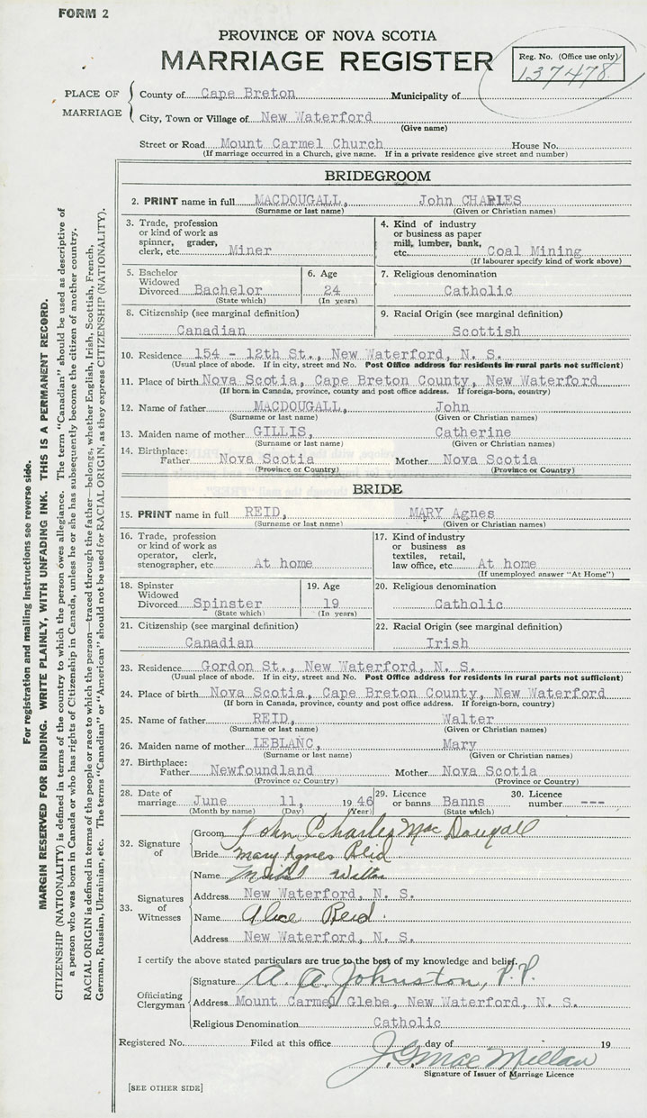 PLACE OF MARRIAGE County of Cape Breton