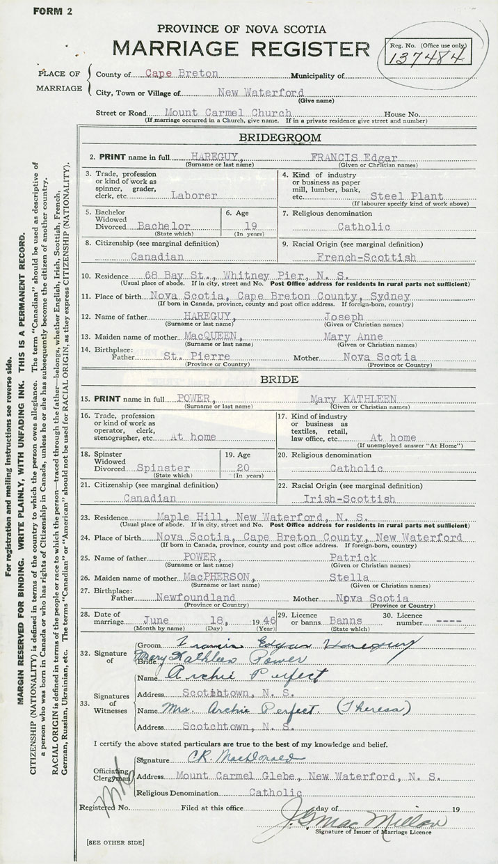 PLACE OF MARRIAGE County of Cape Breton