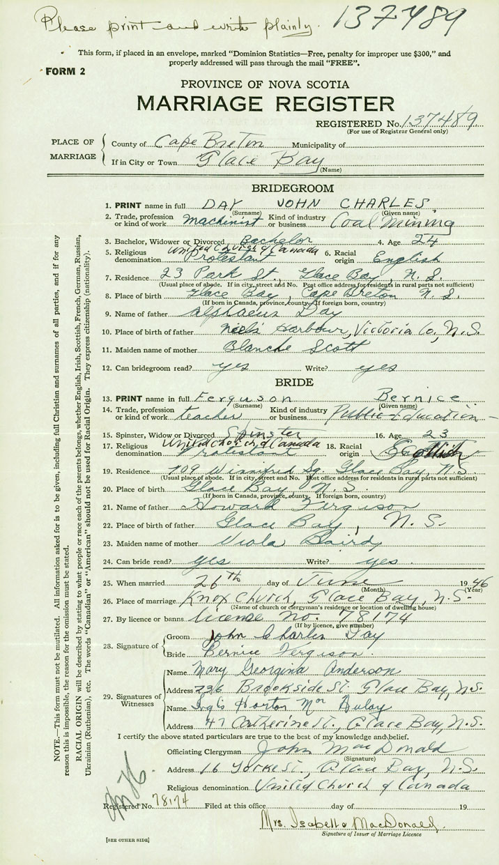 PLACE OF MARRIAGE County of Cape Breton in City or Town Glace Bay