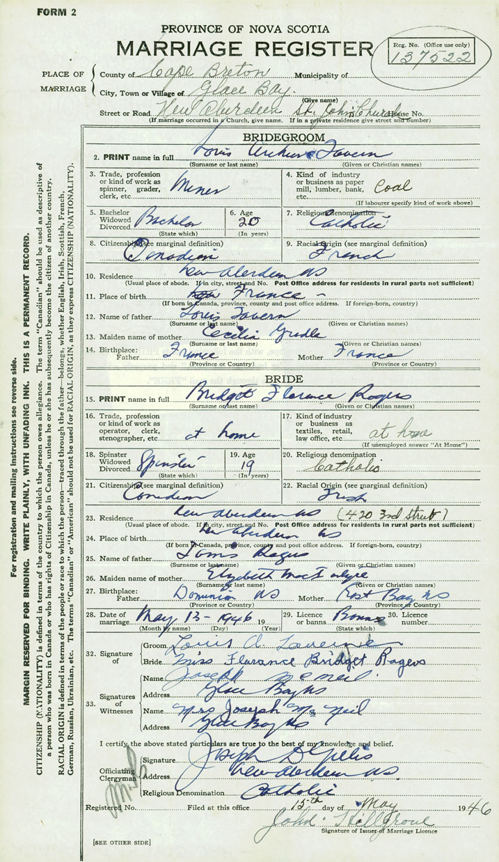 28. Date of marriage May 13 1946 29. By license or banns License 30. License number