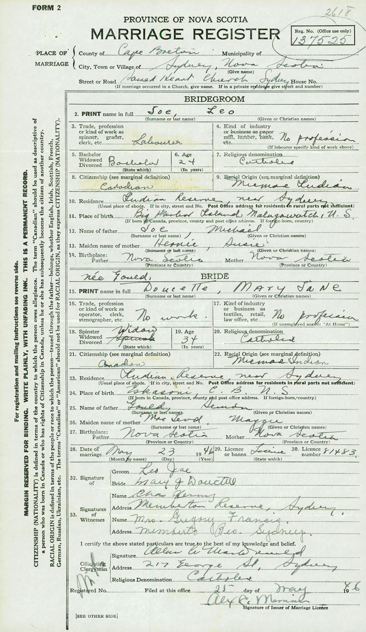 21. Citizenship Canadian 22. Racial origin Micmac Indian