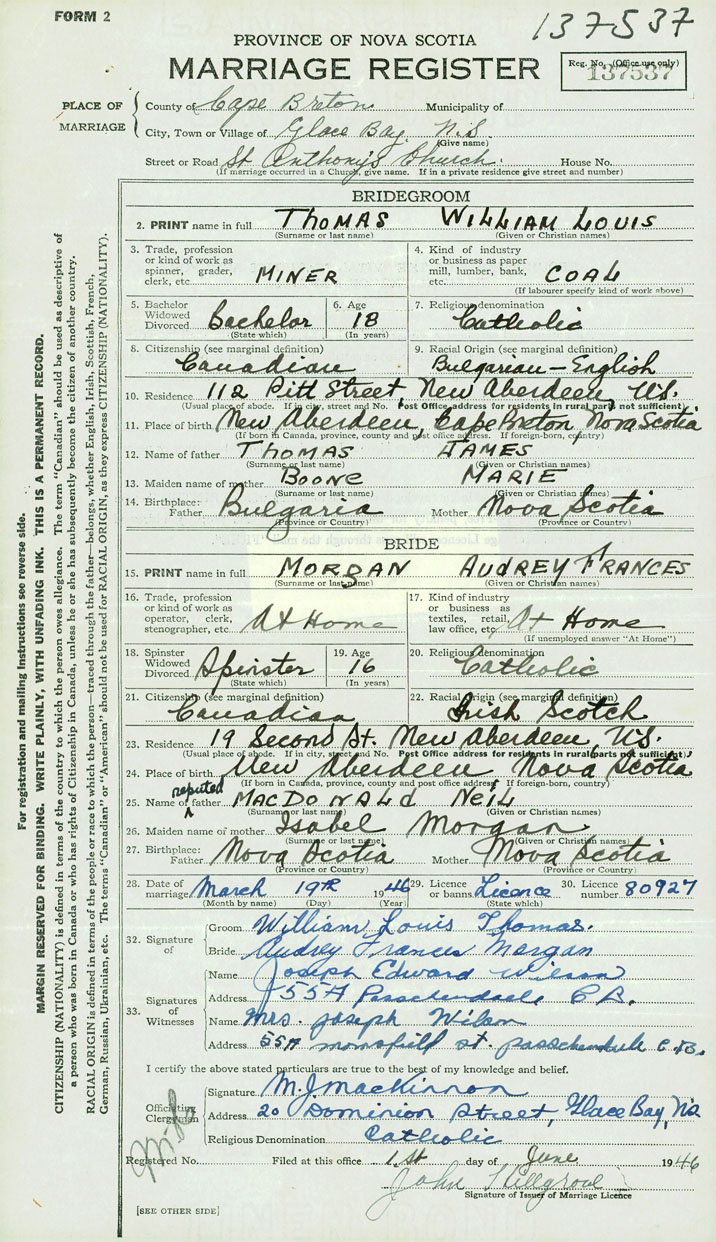 28. Date of marriage March 19 1946 29. By license or banns License 30. License number 80927