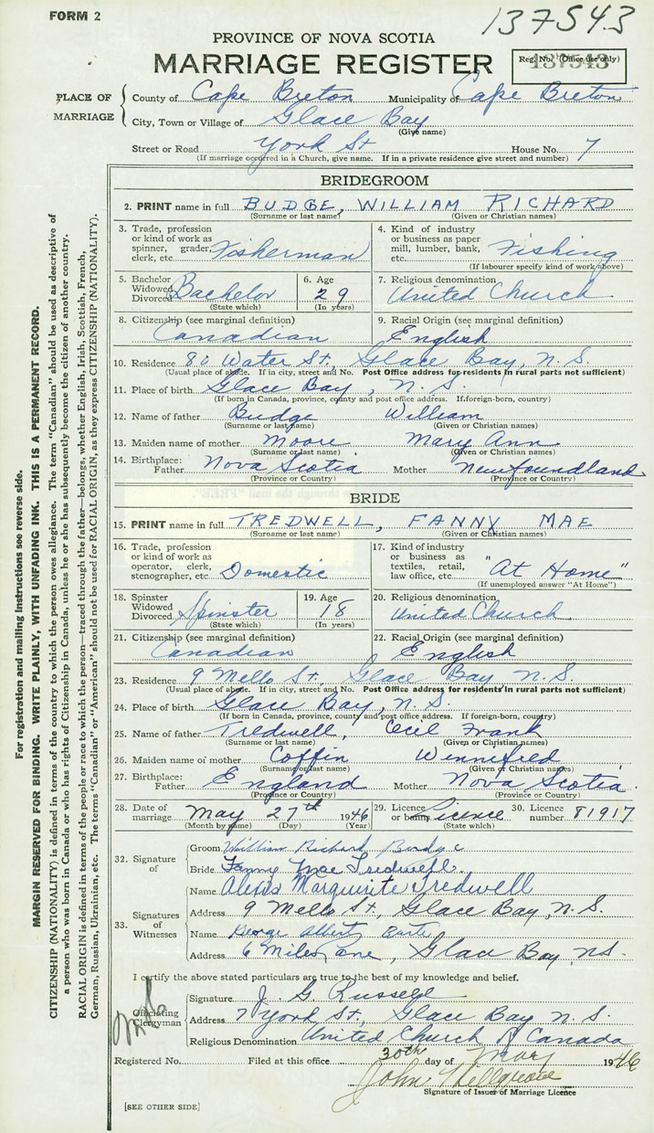 28. Date of marriage May 27 1946 29. By license or banns License 30. License number 81917