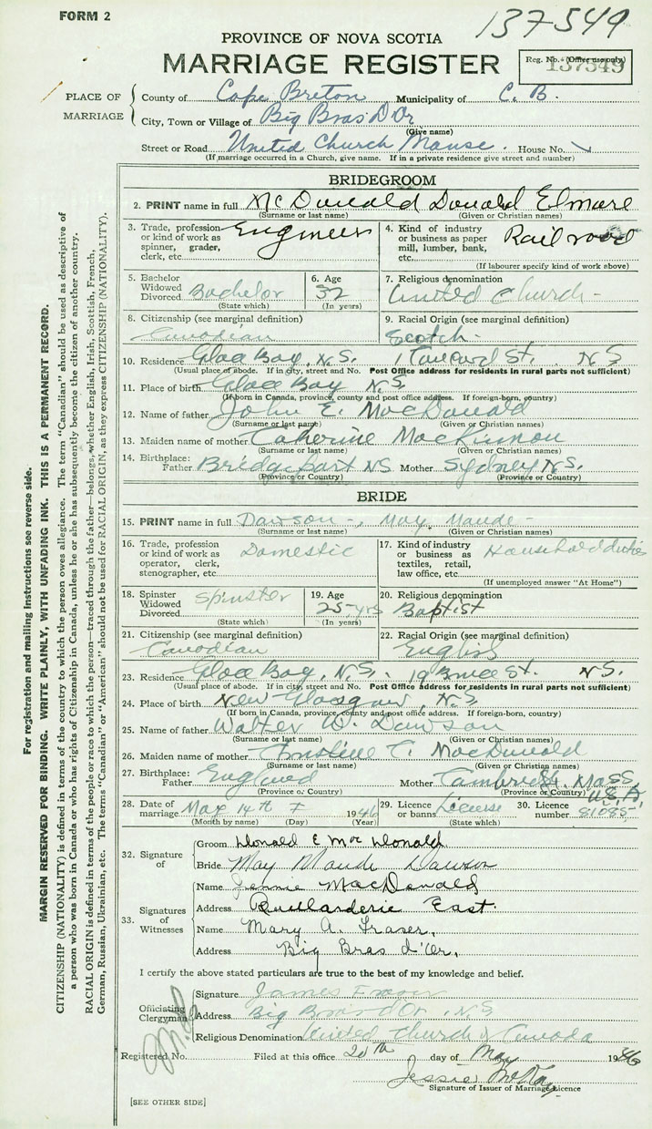 28. Date of marriage May 14 1946 29. By license or banns License 30. License number 81085